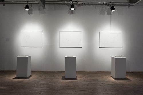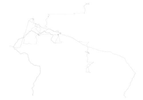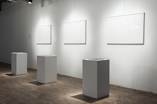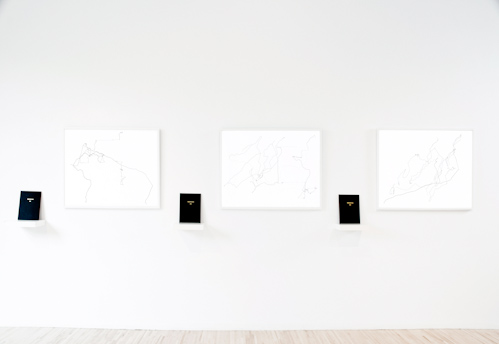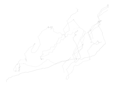 Transaction Trails consists of three digital line drawings, each accompanied by a black bound book. The drawings and corresponding books each represent one year of transactions mapped through the data I collected from my receipts as a consumer. Using google earth maps to geographically map the receipts that are then abstracted represent my movements over the course of several years.